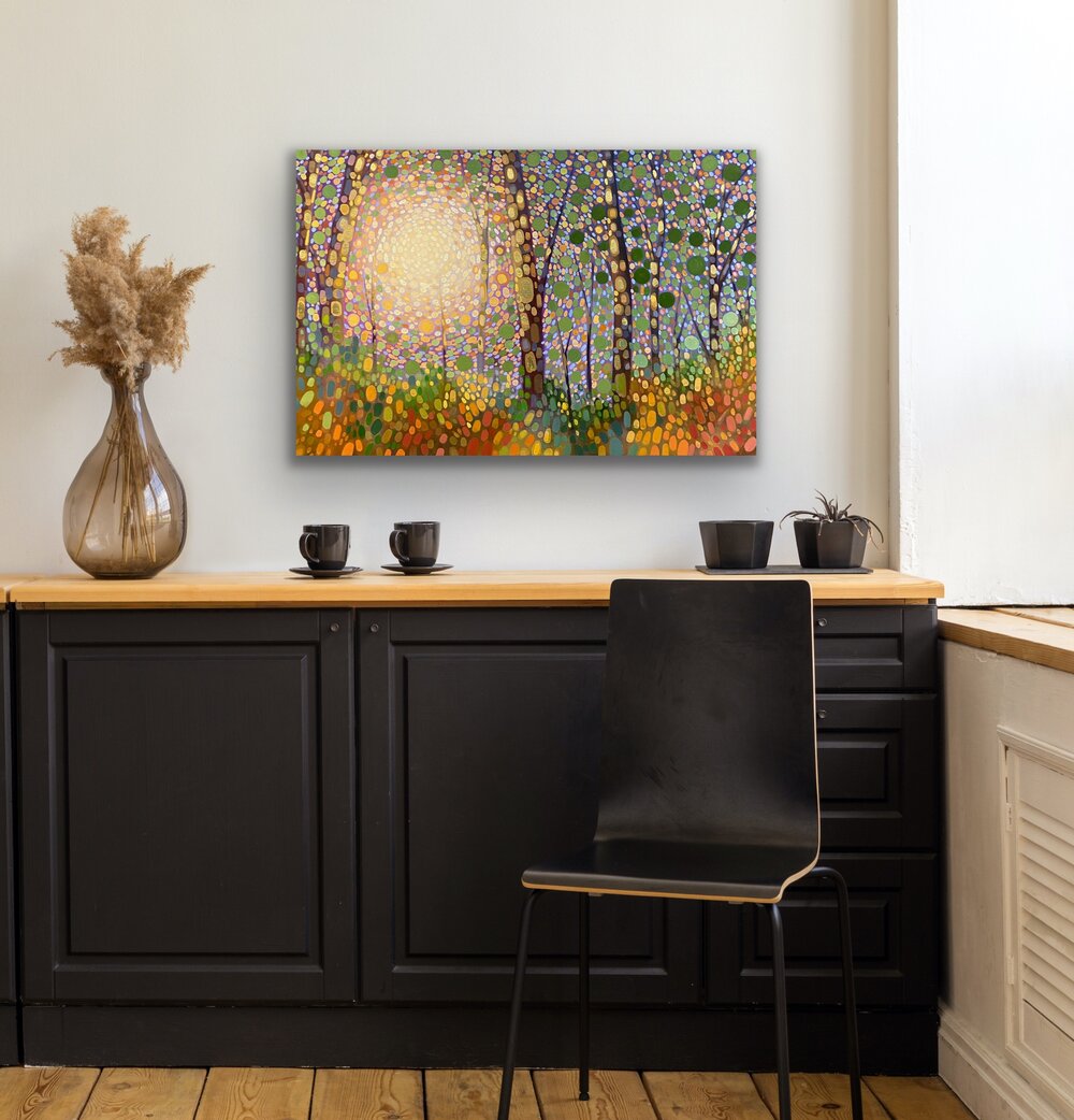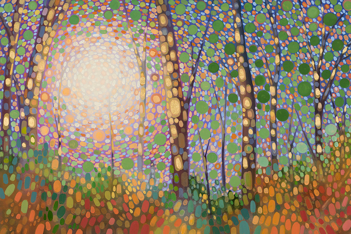 Autumn Celebration plays with light. A glow of sunlight dances on the trees, further pronounced by the use of reflective gold leaf. Pops of color in the foreground ground the viewer within the suspended canopy. 2023 Kristen Pobatschnig